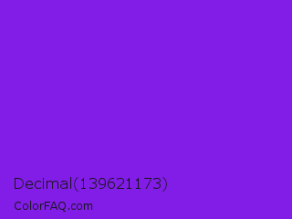 Decimal 139621173 Color is a normal violet color and the nearest color is Blue Violet #8a2be2. Hex code #821de7 and RGB value is rgb(130,29,231). In RGB color space, this color is composed of 51% red, 11% green, 91% blue, In CMYK color space, this color is composed of 44% cyan, 87% magenta, 0% yellow , 9% black , In HSL color space, this color has a hue angle of 270° , 81% saturation and 51% lightness.