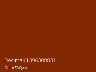 Decimal 139630883 Color is a dark orange color and the nearest color is Smokey Topaz #832a0d. Hex code #822803 and RGB value is rgb(130,40,3). In RGB color space, this color is composed of 51% red, 16% green, 1% blue, In CMYK color space, this color is composed of 0% cyan, 69% magenta, 98% yellow , 49% black , In HSL color space, this color has a hue angle of 17° , 95% saturation and 26% lightness.