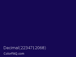 Decimal 2234712068 Color is a very dark indigo color and the nearest color is Tolopea #1b0245. Hex code #160854 and RGB value is rgb(22,8,84). In RGB color space, this color is composed of 9% red, 3% green, 33% blue, In CMYK color space, this color is composed of 74% cyan, 90% magenta, 0% yellow , 67% black , In HSL color space, this color has a hue angle of 251° , 83% saturation and 18% lightness.