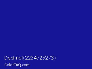 Decimal 2234725273 Color is a normal blue color and the nearest color is Ultramarine #120a8f. Hex code #161597 and RGB value is rgb(22,21,151). In RGB color space, this color is composed of 9% red, 8% green, 59% blue, In CMYK color space, this color is composed of 85% cyan, 86% magenta, 0% yellow , 41% black , In HSL color space, this color has a hue angle of 240° , 76% saturation and 34% lightness.