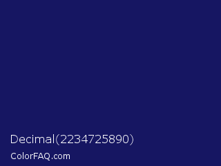 Decimal 2234725890 Color is a dark blue color and the nearest color is Lucky Point #1a1a68. Hex code #161662 and RGB value is rgb(22,22,98). In RGB color space, this color is composed of 9% red, 9% green, 38% blue, In CMYK color space, this color is composed of 78% cyan, 78% magenta, 0% yellow , 62% black , In HSL color space, this color has a hue angle of 240° , 63% saturation and 24% lightness.