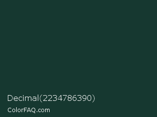 Decimal 2234786390 Color is a very dark cyan color and the nearest color is Gable Green #163531. Hex code #163830 and RGB value is rgb(22,56,48). In RGB color space, this color is composed of 9% red, 22% green, 19% blue, In CMYK color space, this color is composed of 61% cyan, 0% magenta, 14% yellow , 78% black , In HSL color space, this color has a hue angle of 166° , 44% saturation and 15% lightness.
