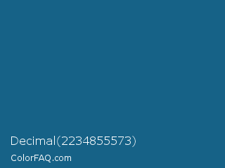 Decimal 2234855573 Color is a normal blue color and the nearest color is Blue Sapphire #126180. Hex code #166287 and RGB value is rgb(22,98,135). In RGB color space, this color is composed of 9% red, 38% green, 53% blue, In CMYK color space, this color is composed of 84% cyan, 27% magenta, 0% yellow , 47% black , In HSL color space, this color has a hue angle of 200° , 72% saturation and 31% lightness.