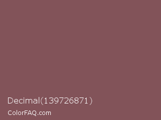 Decimal 139726871 Color is a normal red color and the nearest color is Deep Taupe #7e5e60. Hex code #825359 and RGB value is rgb(130,83,89). In RGB color space, this color is composed of 51% red, 33% green, 35% blue, In CMYK color space, this color is composed of 0% cyan, 36% magenta, 32% yellow , 49% black , In HSL color space, this color has a hue angle of 352° , 22% saturation and 42% lightness.