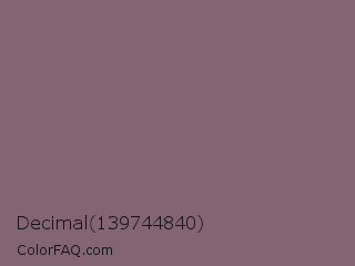 Decimal 139744840 Color is a normal rose color and the nearest color is Falcon #7f626d. Hex code #826570 and RGB value is rgb(130,101,112). In RGB color space, this color is composed of 51% red, 40% green, 44% blue, In CMYK color space, this color is composed of 0% cyan, 22% magenta, 14% yellow , 49% black , In HSL color space, this color has a hue angle of 337° , 13% saturation and 45% lightness.