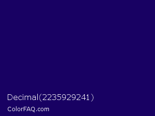 Decimal 2235929241 Color is a very dark indigo color and the nearest color is Paua #260368. Hex code #180163 and RGB value is rgb(24,1,99). In RGB color space, this color is composed of 9% red, 0% green, 39% blue, In CMYK color space, this color is composed of 76% cyan, 99% magenta, 0% yellow , 61% black , In HSL color space, this color has a hue angle of 254° , 98% saturation and 20% lightness.