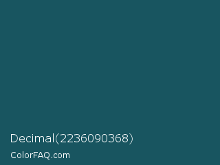 Decimal 2236090368 Color is a dark cyan color and the nearest color is Eden #105852. Hex code #185560 and RGB value is rgb(24,85,96). In RGB color space, this color is composed of 9% red, 33% green, 38% blue, In CMYK color space, this color is composed of 75% cyan, 11% magenta, 0% yellow , 62% black , In HSL color space, this color has a hue angle of 189° , 60% saturation and 24% lightness.