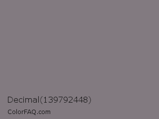 Decimal 139792448 Color is a normal magenta color and the nearest color is Gray #808080. Hex code #827a80 and RGB value is rgb(130,122,128). In RGB color space, this color is composed of 51% red, 48% green, 50% blue, In CMYK color space, this color is composed of 0% cyan, 6% magenta, 2% yellow , 49% black , In HSL color space, this color has a hue angle of 315° , 3% saturation and 49% lightness.