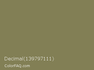 Decimal 139797111 Color is a normal yellow color and the nearest color is Gold Fusion #85754e. Hex code #827f55 and RGB value is rgb(130,127,85). In RGB color space, this color is composed of 51% red, 50% green, 33% blue, In CMYK color space, this color is composed of 0% cyan, 2% magenta, 35% yellow , 49% black , In HSL color space, this color has a hue angle of 56° , 21% saturation and 42% lightness.