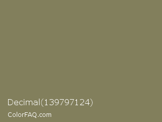 Decimal 139797124 Color is a normal yellow color and the nearest color is Clay Creek #8a8360. Hex code #827f5c and RGB value is rgb(130,127,92). In RGB color space, this color is composed of 51% red, 50% green, 36% blue, In CMYK color space, this color is composed of 0% cyan, 2% magenta, 29% yellow , 49% black , In HSL color space, this color has a hue angle of 55° , 17% saturation and 44% lightness.