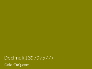Decimal 139797577 Color is a dark yellow color and the nearest color is Olive #808000. Hex code #828001 and RGB value is rgb(130,128,1). In RGB color space, this color is composed of 51% red, 50% green, 0% blue, In CMYK color space, this color is composed of 0% cyan, 2% magenta, 99% yellow , 49% black , In HSL color space, this color has a hue angle of 59° , 98% saturation and 26% lightness.