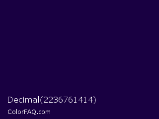 Decimal 2236761414 Color is a very dark violet color and the nearest color is Tolopea #1b0245. Hex code #190042 and RGB value is rgb(25,0,66). In RGB color space, this color is composed of 10% red, 0% green, 26% blue, In CMYK color space, this color is composed of 62% cyan, 100% magenta, 0% yellow , 74% black , In HSL color space, this color has a hue angle of 263° , 100% saturation and 13% lightness.