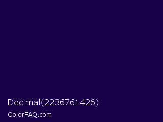 Decimal 2236761426 Color is a very dark violet color and the nearest color is Tolopea #1b0245. Hex code #190048 and RGB value is rgb(25,0,72). In RGB color space, this color is composed of 10% red, 0% green, 28% blue, In CMYK color space, this color is composed of 65% cyan, 100% magenta, 0% yellow , 72% black , In HSL color space, this color has a hue angle of 261° , 100% saturation and 14% lightness.
