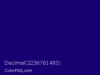 Decimal 2236761493 Color is a dark indigo color and the nearest color is Deep Blue #220878. Hex code #190073 and RGB value is rgb(25,0,115). In RGB color space, this color is composed of 10% red, 0% green, 45% blue, In CMYK color space, this color is composed of 78% cyan, 100% magenta, 0% yellow , 55% black , In HSL color space, this color has a hue angle of 253° , 100% saturation and 23% lightness.
