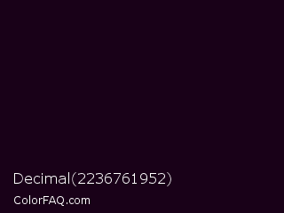 Decimal 2236761952 Color is a almost black magenta color and the nearest color is Black Russian #0a001c. Hex code #190118 and RGB value is rgb(25,1,24). In RGB color space, this color is composed of 10% red, 0% green, 9% blue, In CMYK color space, this color is composed of 0% cyan, 96% magenta, 4% yellow , 90% black , In HSL color space, this color has a hue angle of 303° , 92% saturation and 5% lightness.