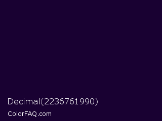 Decimal 2236761990 Color is a very dark violet color and the nearest color is Black Rock #0d0332. Hex code #190132 and RGB value is rgb(25,1,50). In RGB color space, this color is composed of 10% red, 0% green, 20% blue, In CMYK color space, this color is composed of 50% cyan, 98% magenta, 0% yellow , 80% black , In HSL color space, this color has a hue angle of 269° , 96% saturation and 10% lightness.