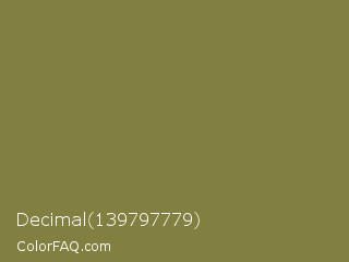 Decimal 139797779 Color is a normal yellow color and the nearest color is Old Moss Green #867e36. Hex code #828041 and RGB value is rgb(130,128,65). In RGB color space, this color is composed of 51% red, 50% green, 25% blue, In CMYK color space, this color is composed of 0% cyan, 2% magenta, 50% yellow , 49% black , In HSL color space, this color has a hue angle of 58° , 33% saturation and 38% lightness.