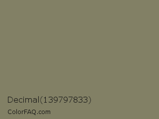 Decimal 139797833 Color is a normal yellow color and the nearest color is Flax Smoke #7b8265. Hex code #828065 and RGB value is rgb(130,128,101). In RGB color space, this color is composed of 51% red, 50% green, 40% blue, In CMYK color space, this color is composed of 0% cyan, 2% magenta, 22% yellow , 49% black , In HSL color space, this color has a hue angle of 56° , 13% saturation and 45% lightness.