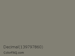 Decimal 139797860 Color is a normal yellow color and the nearest color is Friar Gray #807e79. Hex code #828074 and RGB value is rgb(130,128,116). In RGB color space, this color is composed of 51% red, 50% green, 45% blue, In CMYK color space, this color is composed of 0% cyan, 2% magenta, 11% yellow , 49% black , In HSL color space, this color has a hue angle of 51° , 6% saturation and 48% lightness.