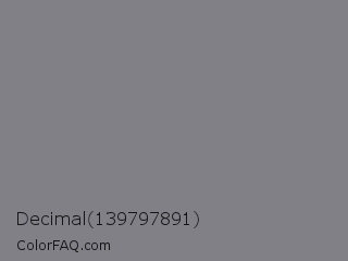 Decimal 139797891 Color is a normal indigo color and the nearest color is Gunsmoke #828685. Hex code #828087 and RGB value is rgb(130,128,135). In RGB color space, this color is composed of 51% red, 50% green, 53% blue, In CMYK color space, this color is composed of 4% cyan, 5% magenta, 0% yellow , 47% black , In HSL color space, this color has a hue angle of 257° , 3% saturation and 52% lightness.