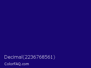 Decimal 2236768561 Color is a dark indigo color and the nearest color is Deep Blue #220878. Hex code #190673 and RGB value is rgb(25,6,115). In RGB color space, this color is composed of 10% red, 2% green, 45% blue, In CMYK color space, this color is composed of 78% cyan, 95% magenta, 0% yellow , 55% black , In HSL color space, this color has a hue angle of 250° , 90% saturation and 24% lightness.