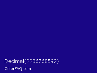 Decimal 2236768592 Color is a dark indigo color and the nearest color is Ultramarine #120a8f. Hex code #190686 and RGB value is rgb(25,6,134). In RGB color space, this color is composed of 10% red, 2% green, 53% blue, In CMYK color space, this color is composed of 81% cyan, 96% magenta, 0% yellow , 47% black , In HSL color space, this color has a hue angle of 249° , 91% saturation and 27% lightness.