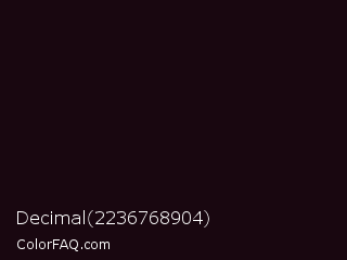 Decimal 2236768904 Color is a almost black rose color and the nearest color is Licorice #1a1110. Hex code #190710 and RGB value is rgb(25,7,16). In RGB color space, this color is composed of 10% red, 3% green, 6% blue, In CMYK color space, this color is composed of 0% cyan, 72% magenta, 36% yellow , 90% black , In HSL color space, this color has a hue angle of 330° , 56% saturation and 6% lightness.