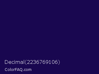 Decimal 2236769106 Color is a very dark indigo color and the nearest color is Tolopea #1b0245. Hex code #190750 and RGB value is rgb(25,7,80). In RGB color space, this color is composed of 10% red, 3% green, 31% blue, In CMYK color space, this color is composed of 69% cyan, 91% magenta, 0% yellow , 69% black , In HSL color space, this color has a hue angle of 255° , 84% saturation and 17% lightness.