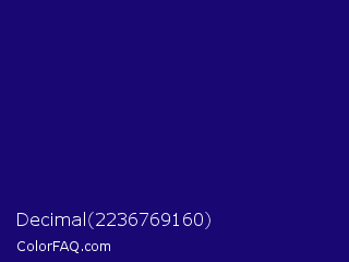 Decimal 2236769160 Color is a dark indigo color and the nearest color is Deep Blue #220878. Hex code #190774 and RGB value is rgb(25,7,116). In RGB color space, this color is composed of 10% red, 3% green, 45% blue, In CMYK color space, this color is composed of 78% cyan, 94% magenta, 0% yellow , 55% black , In HSL color space, this color has a hue angle of 250° , 89% saturation and 24% lightness.