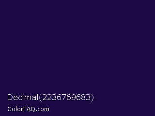 Decimal 2236769683 Color is a very dark indigo color and the nearest color is Tolopea #1b0245. Hex code #190841 and RGB value is rgb(25,8,65). In RGB color space, this color is composed of 10% red, 3% green, 25% blue, In CMYK color space, this color is composed of 62% cyan, 88% magenta, 0% yellow , 75% black , In HSL color space, this color has a hue angle of 258° , 78% saturation and 14% lightness.