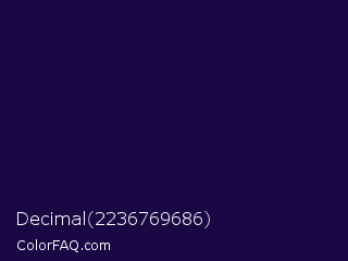 Decimal 2236769686 Color is a very dark indigo color and the nearest color is Tolopea #1b0245. Hex code #190844 and RGB value is rgb(25,8,68). In RGB color space, this color is composed of 10% red, 3% green, 27% blue, In CMYK color space, this color is composed of 63% cyan, 88% magenta, 0% yellow , 73% black , In HSL color space, this color has a hue angle of 257° , 79% saturation and 15% lightness.