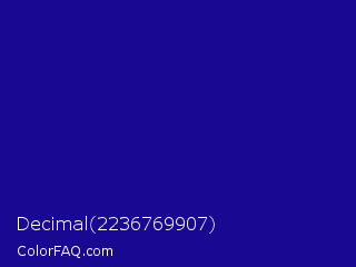 Decimal 2236769907 Color is a dark indigo color and the nearest color is Ultramarine #120a8f. Hex code #190891 and RGB value is rgb(25,8,145). In RGB color space, this color is composed of 10% red, 3% green, 57% blue, In CMYK color space, this color is composed of 83% cyan, 94% magenta, 0% yellow , 43% black , In HSL color space, this color has a hue angle of 247° , 90% saturation and 30% lightness.