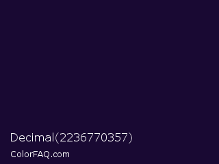Decimal 2236770357 Color is a very dark violet color and the nearest color is Haiti #1b1035. Hex code #190933 and RGB value is rgb(25,9,51). In RGB color space, this color is composed of 10% red, 4% green, 20% blue, In CMYK color space, this color is composed of 51% cyan, 82% magenta, 0% yellow , 80% black , In HSL color space, this color has a hue angle of 263° , 70% saturation and 12% lightness.
