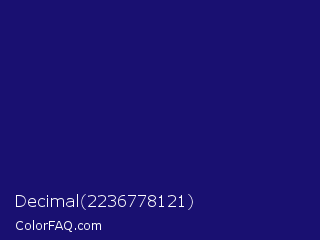 Decimal 2236778121 Color is a dark indigo color and the nearest color is Midnight Blue #191970. Hex code #191071 and RGB value is rgb(25,16,113). In RGB color space, this color is composed of 10% red, 6% green, 44% blue, In CMYK color space, this color is composed of 78% cyan, 86% magenta, 0% yellow , 56% black , In HSL color space, this color has a hue angle of 246° , 75% saturation and 25% lightness.