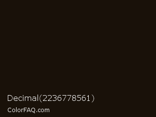 Decimal 2236778561 Color is a almost black orange color and the nearest color is Crowshead #1c1208. Hex code #191109 and RGB value is rgb(25,17,9). In RGB color space, this color is composed of 10% red, 7% green, 4% blue, In CMYK color space, this color is composed of 0% cyan, 32% magenta, 64% yellow , 90% black , In HSL color space, this color has a hue angle of 30° , 47% saturation and 7% lightness.