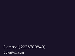 Decimal 2236780840 Color is a very dark indigo color and the nearest color is Mirage #161928. Hex code #191228 and RGB value is rgb(25,18,40). In RGB color space, this color is composed of 10% red, 7% green, 16% blue, In CMYK color space, this color is composed of 38% cyan, 55% magenta, 0% yellow , 84% black , In HSL color space, this color has a hue angle of 259° , 38% saturation and 11% lightness.