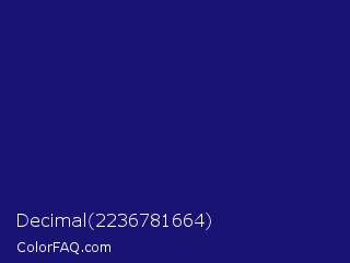 Decimal 2236781664 Color is a dark indigo color and the nearest color is Midnight Blue #191970. Hex code #191374 and RGB value is rgb(25,19,116). In RGB color space, this color is composed of 10% red, 7% green, 45% blue, In CMYK color space, this color is composed of 78% cyan, 84% magenta, 0% yellow , 55% black , In HSL color space, this color has a hue angle of 244° , 72% saturation and 26% lightness.