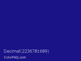 Decimal 2236781689 Color is a dark indigo color and the nearest color is Deep Koamaru #1b127b. Hex code #191387 and RGB value is rgb(25,19,135). In RGB color space, this color is composed of 10% red, 7% green, 53% blue, In CMYK color space, this color is composed of 81% cyan, 86% magenta, 0% yellow , 47% black , In HSL color space, this color has a hue angle of 243° , 75% saturation and 30% lightness.