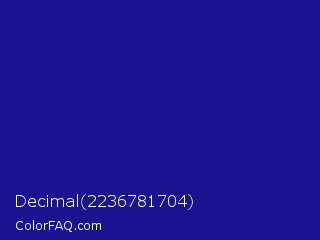 Decimal 2236781704 Color is a normal indigo color and the nearest color is Ultramarine #120a8f. Hex code #191390 and RGB value is rgb(25,19,144). In RGB color space, this color is composed of 10% red, 7% green, 56% blue, In CMYK color space, this color is composed of 83% cyan, 87% magenta, 0% yellow , 44% black , In HSL color space, this color has a hue angle of 243° , 77% saturation and 32% lightness.