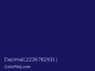 Decimal 2236782931 Color is a dark indigo color and the nearest color is Lucky Point #1a1a68. Hex code #191561 and RGB value is rgb(25,21,97). In RGB color space, this color is composed of 10% red, 8% green, 38% blue, In CMYK color space, this color is composed of 74% cyan, 78% magenta, 0% yellow , 62% black , In HSL color space, this color has a hue angle of 243° , 64% saturation and 23% lightness.