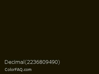 Decimal 2236809490 Color is a almost black yellow color and the nearest color is Acadia #1b1404. Hex code #191600 and RGB value is rgb(25,22,0). In RGB color space, this color is composed of 10% red, 9% green, 0% blue, In CMYK color space, this color is composed of 0% cyan, 12% magenta, 100% yellow , 90% black , In HSL color space, this color has a hue angle of 53° , 100% saturation and 5% lightness.