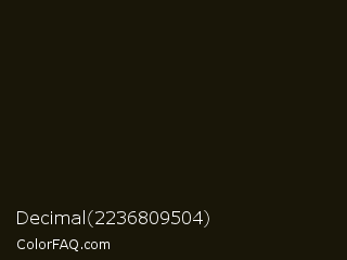 Decimal 2236809504 Color is a almost black yellow color and the nearest color is Acadia #1b1404. Hex code #191608 and RGB value is rgb(25,22,8). In RGB color space, this color is composed of 10% red, 9% green, 3% blue, In CMYK color space, this color is composed of 0% cyan, 12% magenta, 68% yellow , 90% black , In HSL color space, this color has a hue angle of 49° , 52% saturation and 6% lightness.