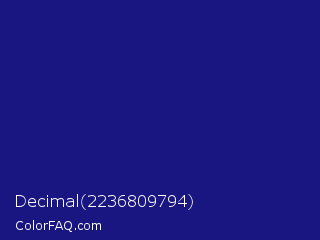 Decimal 2236809794 Color is a dark indigo color and the nearest color is Deep Koamaru #1b127b. Hex code #191682 and RGB value is rgb(25,22,130). In RGB color space, this color is composed of 10% red, 9% green, 51% blue, In CMYK color space, this color is composed of 81% cyan, 83% magenta, 0% yellow , 49% black , In HSL color space, this color has a hue angle of 242° , 71% saturation and 30% lightness.
