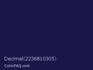 Decimal 2236810305 Color is a very dark indigo color and the nearest color is Bunting #151f4c. Hex code #191749 and RGB value is rgb(25,23,73). In RGB color space, this color is composed of 10% red, 9% green, 29% blue, In CMYK color space, this color is composed of 66% cyan, 68% magenta, 0% yellow , 71% black , In HSL color space, this color has a hue angle of 242° , 52% saturation and 19% lightness.