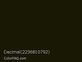 Decimal 2236810792 Color is a almost black yellow color and the nearest color is Acadia #1b1404. Hex code #191804 and RGB value is rgb(25,24,4). In RGB color space, this color is composed of 10% red, 9% green, 2% blue, In CMYK color space, this color is composed of 0% cyan, 4% magenta, 84% yellow , 90% black , In HSL color space, this color has a hue angle of 57° , 72% saturation and 6% lightness.