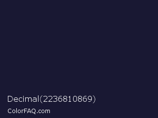 Decimal 2236810869 Color is a very dark indigo color and the nearest color is Haiti #1b1035. Hex code #191833 and RGB value is rgb(25,24,51). In RGB color space, this color is composed of 10% red, 9% green, 20% blue, In CMYK color space, this color is composed of 51% cyan, 53% magenta, 0% yellow , 80% black , In HSL color space, this color has a hue angle of 242° , 36% saturation and 15% lightness.