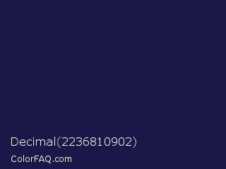 Decimal 2236810902 Color is a very dark indigo color and the nearest color is Bunting #151f4c. Hex code #191848 and RGB value is rgb(25,24,72). In RGB color space, this color is composed of 10% red, 9% green, 28% blue, In CMYK color space, this color is composed of 65% cyan, 67% magenta, 0% yellow , 72% black , In HSL color space, this color has a hue angle of 241° , 50% saturation and 19% lightness.