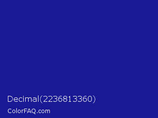 Decimal 2236813360 Color is a normal blue color and the nearest color is Jacksons Purple #20208d. Hex code #191996 and RGB value is rgb(25,25,150). In RGB color space, this color is composed of 10% red, 10% green, 59% blue, In CMYK color space, this color is composed of 83% cyan, 83% magenta, 0% yellow , 41% black , In HSL color space, this color has a hue angle of 240° , 71% saturation and 34% lightness.