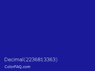 Decimal 2236813363 Color is a normal blue color and the nearest color is Jacksons Purple #20208d. Hex code #191999 and RGB value is rgb(25,25,153). In RGB color space, this color is composed of 10% red, 10% green, 60% blue, In CMYK color space, this color is composed of 84% cyan, 84% magenta, 0% yellow , 40% black , In HSL color space, this color has a hue angle of 240° , 72% saturation and 35% lightness.