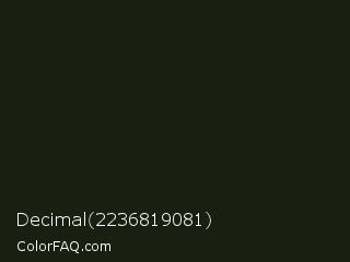 Decimal 2236819081 Color is a very dark green color and the nearest color is Rangoon Green #1c1e13. Hex code #192011 and RGB value is rgb(25,32,17). In RGB color space, this color is composed of 10% red, 13% green, 7% blue, In CMYK color space, this color is composed of 22% cyan, 0% magenta, 47% yellow , 87% black , In HSL color space, this color has a hue angle of 88° , 31% saturation and 10% lightness.